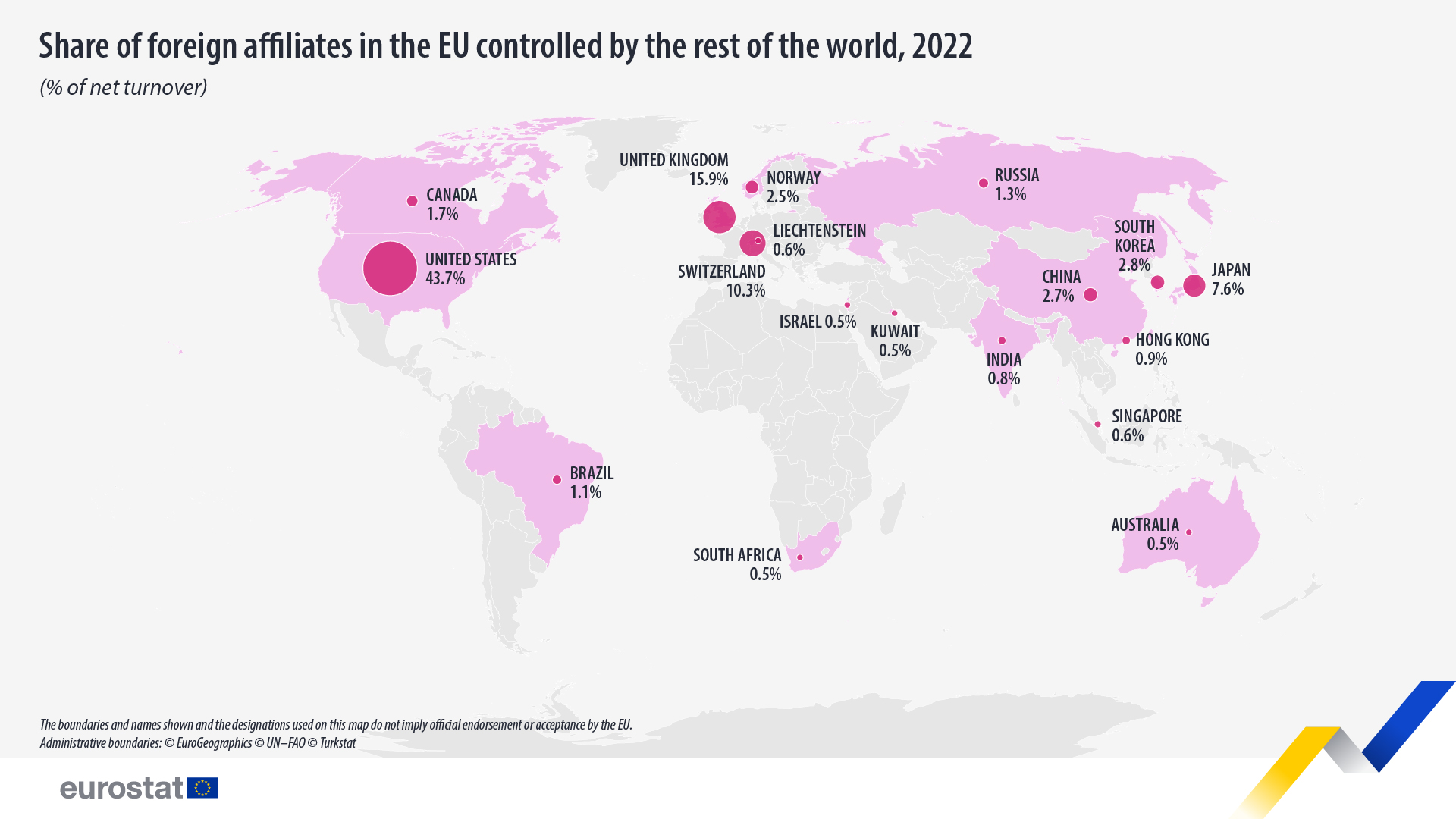 En cuanto al volumen de negocios neto generado por empresas de la UE controladas por países no pertenecientes a la UE, Estados Unidos también representó la mayor parte de la cuota (2.474 mm de euros, 43,7%). El Reino Unido ocupa el segundo lugar (900.000 millones de euros, 15,9%), por delante de Suiza (580.000 millones de euros, 10,3%), Japón (429.000 millones de euros, 7,6%), Corea del Sur (156.000 millones de euros, 2,8%), China (150.000 millones de euros, 2,7%) y Noruega (140.000 millones de euros, 2,5%).