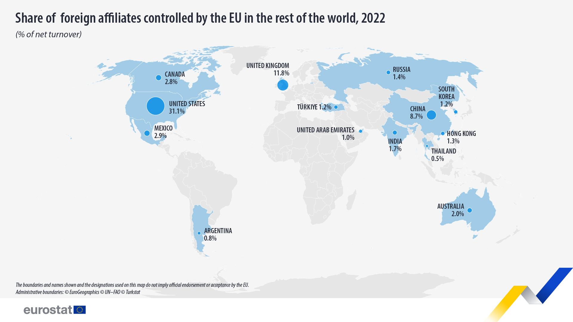 Eurostat señala que las empresas de fuera de la UE, controladas por unas unidades institucionales residentes de la UE, generaron 6.526.000 millones de euros en relación al volumen de negocios neto.