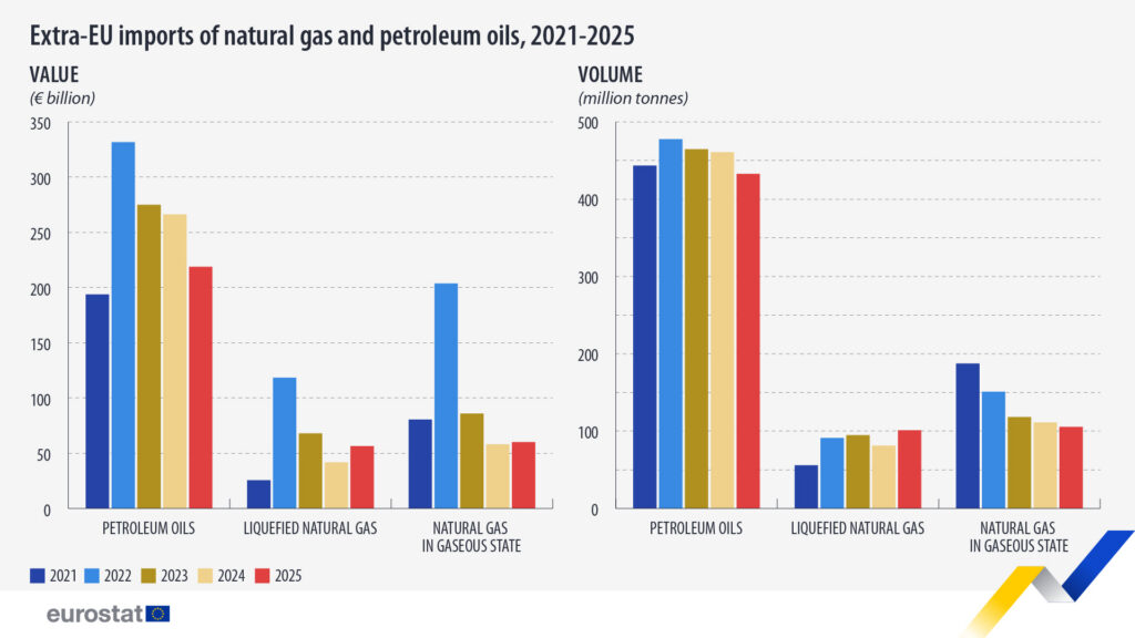Según informa Eurostat, para el petróleo, en comparación con 2024, se informó de una disminución tanto en el valor de los aceites de petróleo importados (-17,8 %) como en el volumen de importaciones (-6,1 %). Por otro lado, el gas licuado importado registró un fuerte aumento tanto en el valor (+35,2 %) como en el volumen (+24,4 %).