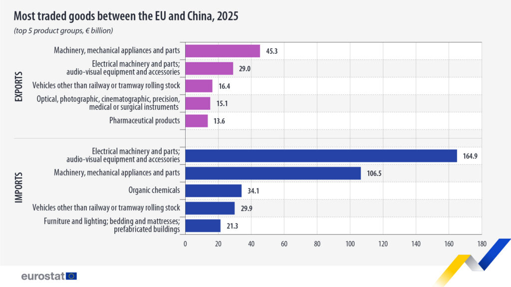 La UE exportó bienes por valor de 199,6 mil millones de euros a China e importó 559.400 millones de euros en 2025, lo que resultó en un déficit comercial de 359,8 mil millones de euros.