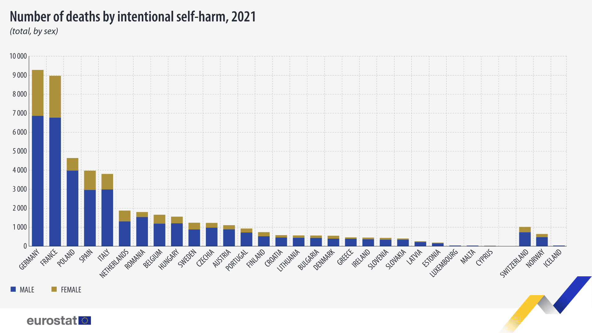 En 2021, se produjeron 47. 346 muertes por suicidio en la UE , lo que corresponde al 0,9 % de todas las muertes notificadas ese año. Esta cifra de fallecidos equivale a una media de 10,2 muertes por cada 100.000 personas.