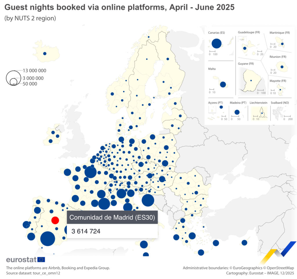 Esta información procede de datos mensuales sobre alojamientos de corta duración ofrecidos a través de plataformas en línea. Eurostat ha publicado hoy los datos correspondientes al tercer trimestre de 2025 a nivel nacional y al segundo trimestre de 2025 a nivel regional.
