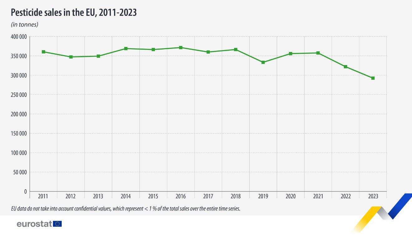 Eurostat ha hecho públicos los últimos datos de la venta de pesticidas durante este martes, dejando como dato principal la caída de esta transacción. La bajada lleva estable durante varios años, en comparación a 2022, hubo una caída del 9% y, frente a 2021, del 18%.