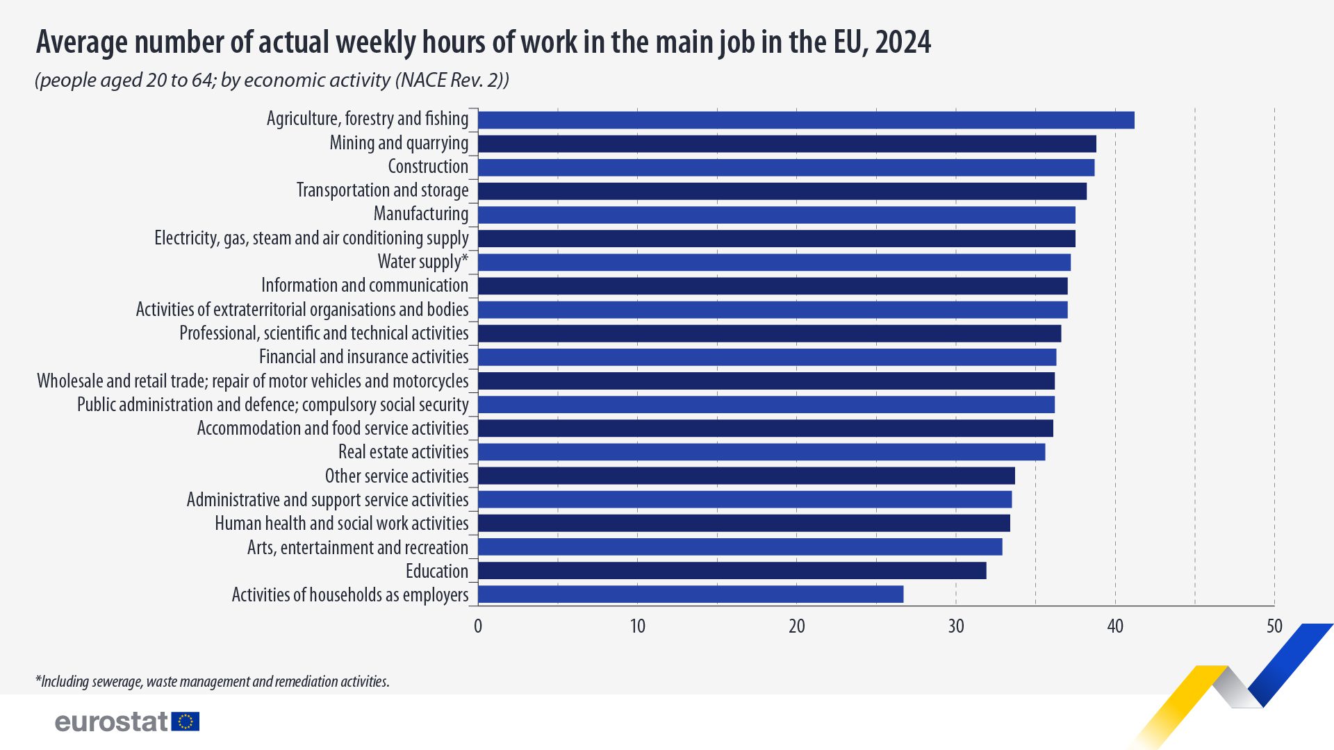 Las actividades económicas que registraron la semana laboral más larga en la UE, en 2024, fueron la agricultura, silvicultura y pesca (41,2 horas de trabajo reales), la minería y canteras (38,8) y la construcción (38,7), mientras que las semanas laborales más cortas se registraron en las actividades de los hogares como empleadores (26,7), la educación (31,9) y las artes, el entretenimiento y la recreación (32,9).
