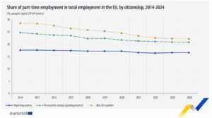 En 2024, los ciudadanos extracomunitarios representaban el 22,2 % del trabajo a tiempo parcial del empleo total en la UE, y los ciudadanos de la UE residentes en otro país de la UE representaban el 20,8 %. Ambas categorías presentaban una proporción mayor que la de los ciudadanos de la UE residentes en su país, que se situó en el 16,6 %.