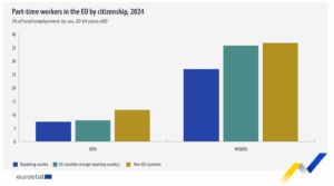 Independientemente de la ciudadanía, a nivel de la UE, las mujeres tenían una mayor proporción de empleo a tiempo parcial que los hombres. En 2024, la mayor brecha entre mujeres y hombres se registró entre los ciudadanos de otro país de la UE, donde el 35,8 % de las mujeres empleadas trabajaban a tiempo parcial, en comparación con el 7,9 % de los hombres.