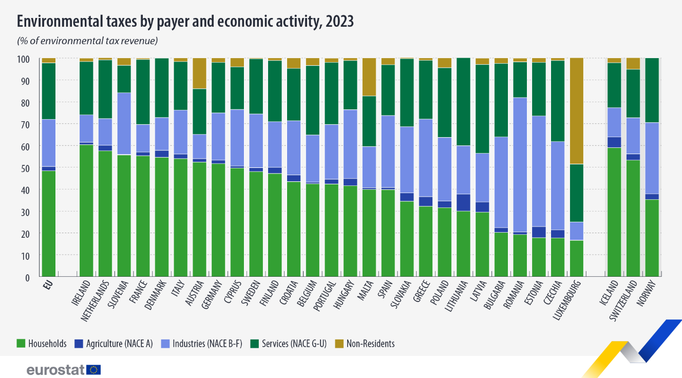 Los hogares aportaron el 48,3 % de los ingresos totales por impuestos ambientales. En 15 países de la UE, los hogares aportaron más del 40 % de los ingresos totales por impuestos ambientales, con una variación entre el 41,5 % en Hungría y el 60,3 % en Irlanda.