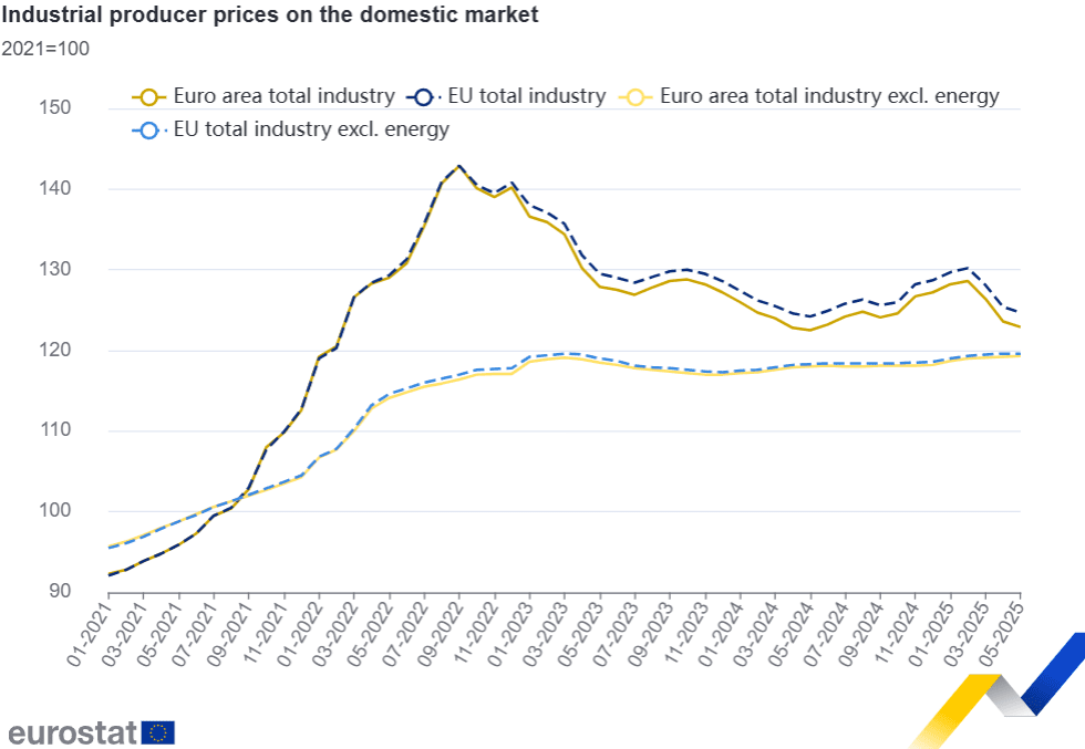 Los precios de producción industrial disminuyeron un 0,6 % tanto en la zona euro como en la UE durante mayo de este año frente al mes anterior. En abril de 2025, los precios de producción industrial cayeron un 2,2 % en la zona euro y un 2,1 % en la UE.