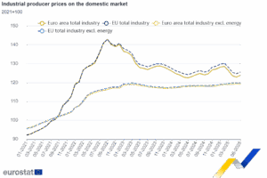 En junio de 2025, en comparación con mayo de 2025, los precios de producción industrial aumentaron un 0,8% en la zona euro y un 0,7% en la UE, según las primeras estimaciones de Eurostat, la oficina estadística de la Unión Europea. En mayo de 2025, los precios de producción industrial cayeron un 0,6% tanto en la zona euro como en la UE.