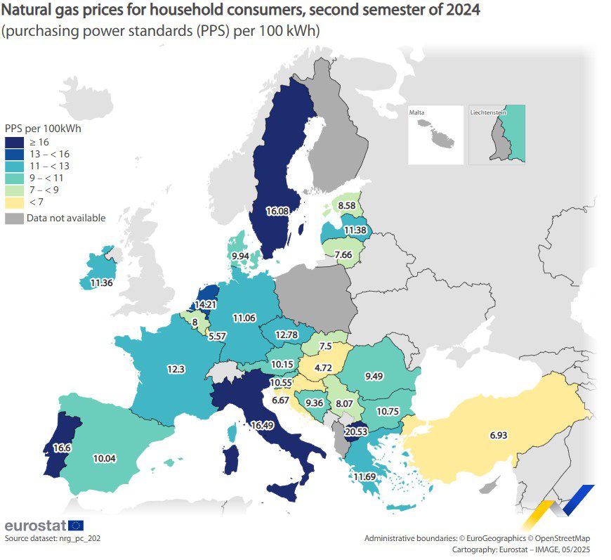 Los precios más altos del gas natural para hogares se observaron en Portugal (16,60), Italia (16,49) y Suecia (16,08). Los precios más bajos, según EPA, se registraron en Hungría (4,72), Luxemburgo (5,57) y Croacia (6,67). En el caso de España, el precio del gas natural es de 10,04.
