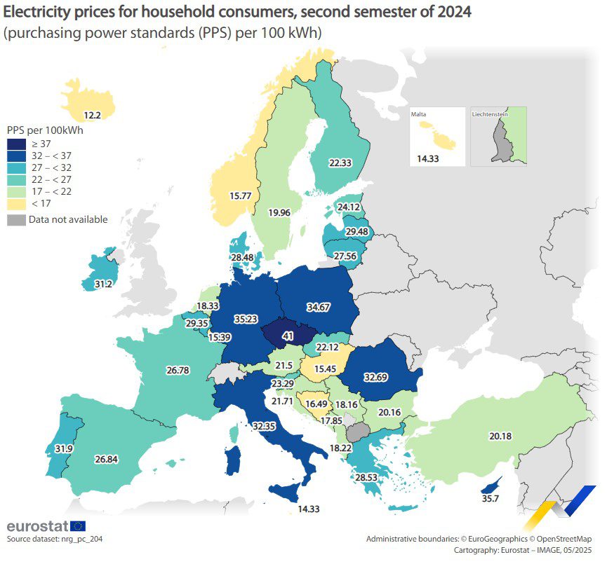 A pesar de la estabilidad de los promedios de la UE, las comparaciones entre monedas nacionales indican fluctuaciones significativas de precios en algunos países. Los precios de la electricidad doméstica aumentaron en Portugal (+14,2 % en comparación con el segundo semestre de 2023), Finlandia (+13,6 %) y Francia (+12,9 %). Mientras tanto, países como Letonia (-17,8 %), Países Bajos (-14,3 %) y Bélgica (-12,3 %) experimentaron reducciones de precios sustanciales.