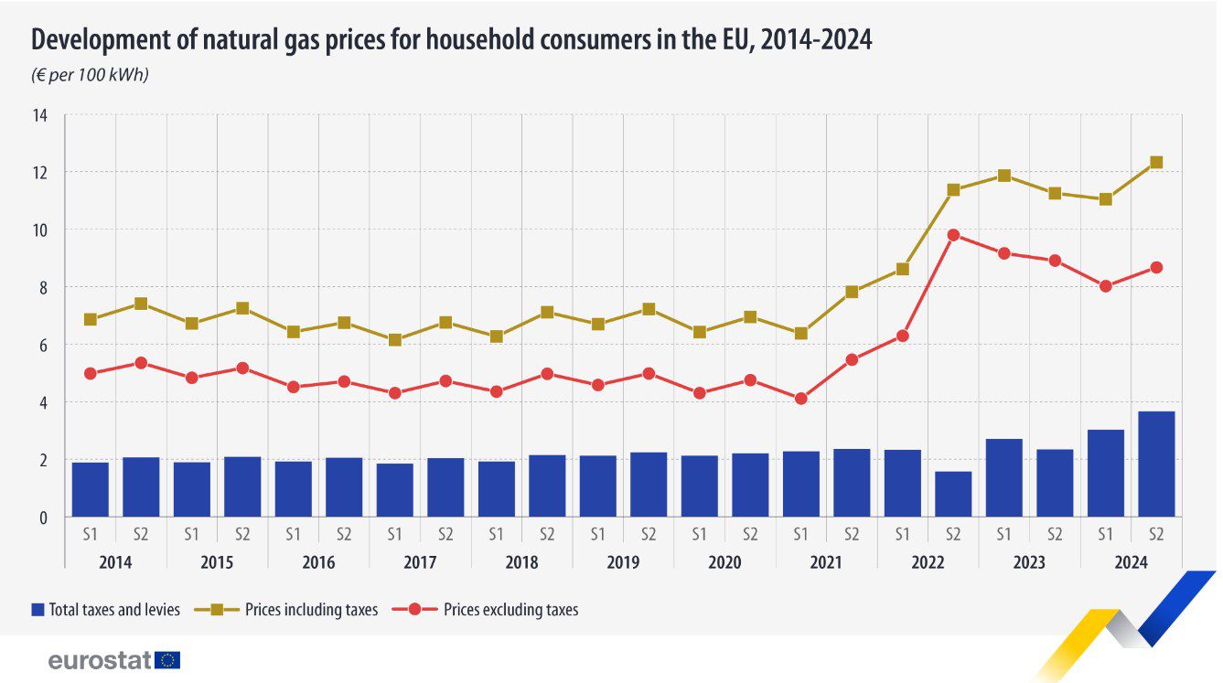 En el segundo semestre de 2024, los precios del gas para uso doméstico en la UE aumentaron por primera vez tras la disminución provocada por la crisis energética de 2022. Los precios medios, con impuestos incluidos, ascendieron a 12,33 € por 100 kWh, frente a los 11,04 € del primer semestre.