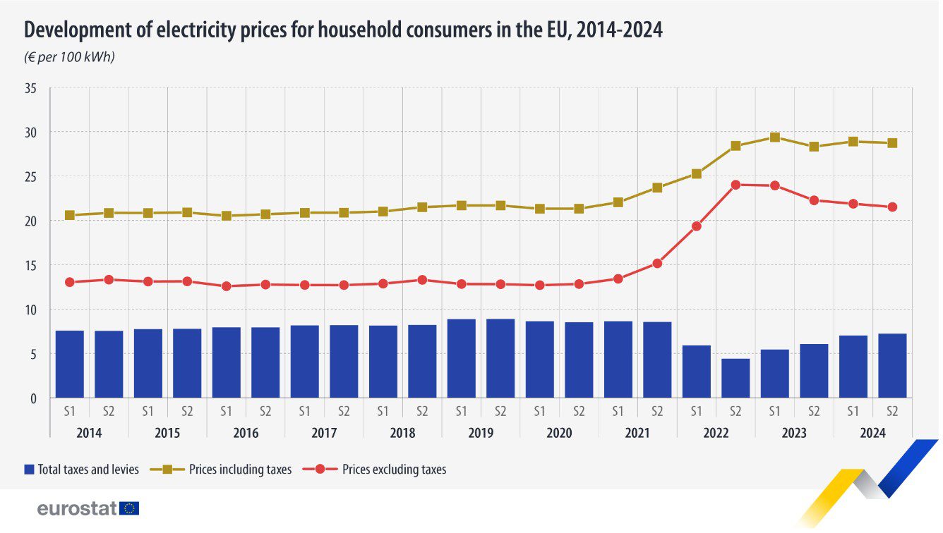 En el segundo semestre de 2024, los precios medios de la electricidad para los hogares de la UE se mantuvieron prácticamente estables, con un ligero descenso hasta los 28,72 € por 100 kWh desde los 28,89 € del primer semestre de 2024. Estos niveles de precios se mantienen muy por encima de los niveles anteriores a la crisis energética de 2022.