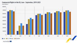 En septiembre de 2025, se registraron 653.072 vuelos comerciales en la UE. Esto representó un aumento del 2,6 % en comparación con septiembre de 2024. Sin embargo, la cifra se mantuvo un 1,8 % inferior a la del mismo mes de 2019.