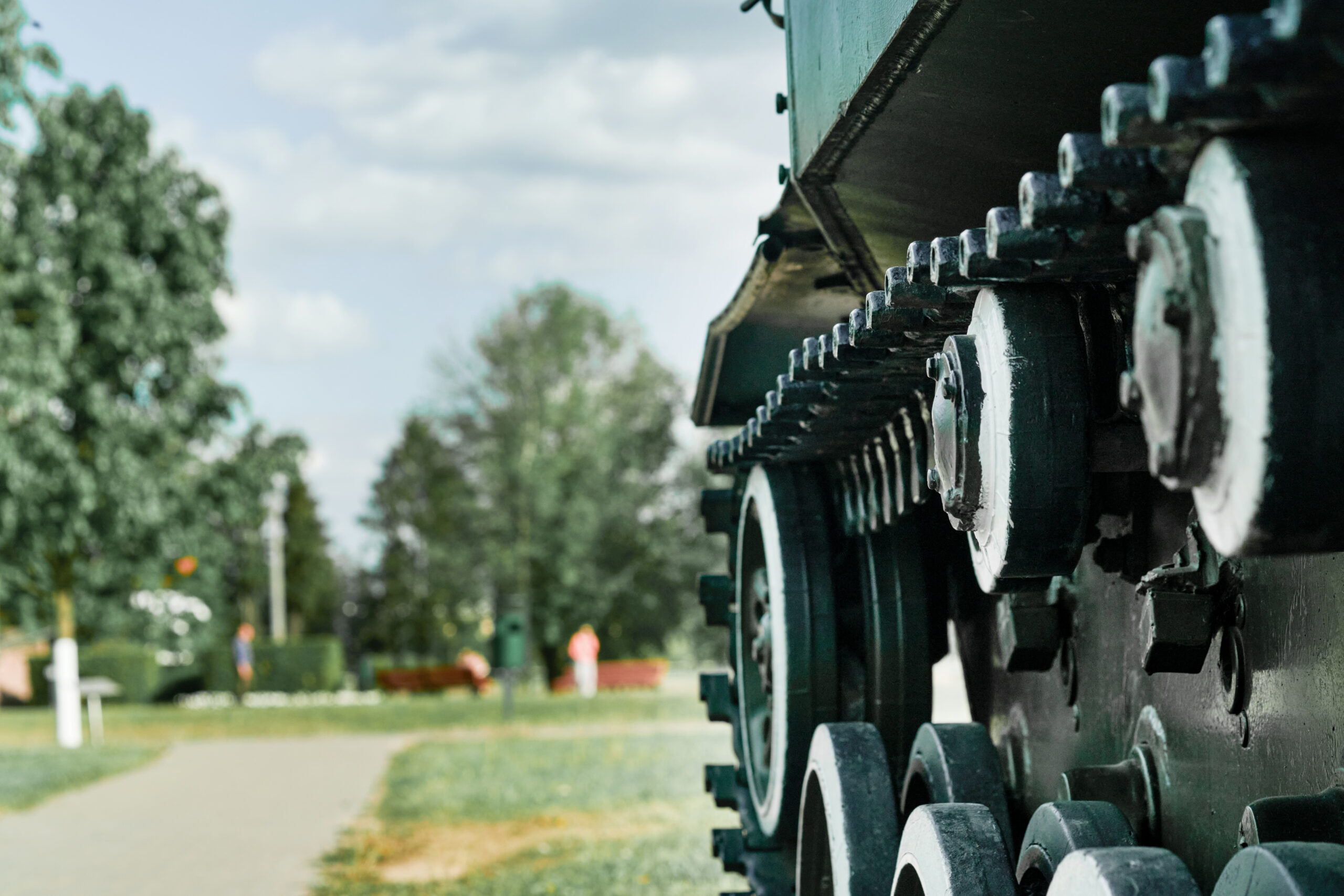 MOGILEV, BELARUS MAY 21 2023 Old tank. Wheels and track closeup and peaceful background Monument to old weapons close-up Symbol of end of war. Old military weapons Equipment of countrys armed forces.