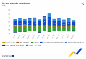 En comparación con agosto de 2024, el saldo de la zona euro disminuyó en 2.000 millones de euros. Esto se atribuyó principalmente a la disminución del superávit de productos químicos, que pasó de 22.900 millones de euros en agosto de 2024 a 18.000 millones de euros en agosto de 2025, junto con una disminución del saldo de maquinaria y vehículos, que pasó de 9.000 millones de euros en agosto de 2024 a 7.800 millones de euros en agosto de 2025.