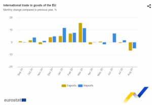 Las exportaciones extracomunitarias de bienes ascendieron a 1,755.500 millones de euros (un incremento del 2,5 % en comparación con enero-agosto de 2024), y las importaciones ascendieron a 1,669.900 millones de euros (un incremento del 4,0 % en comparación con enero-agosto de 2024).