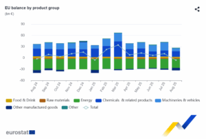 Entre enero y agosto de 2025, la UE registró un superávit de 85.600 millones de euros, frente a los 106.600 millones de euros del mismo período de 2024.