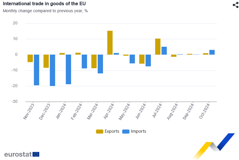 El saldo de la UE mostró un superávit de 3.900 millones de euros en el comercio de bienes con el resto del mundo en octubre de 2024, frente a los 8.400 millones de euros de octubre de 2023.