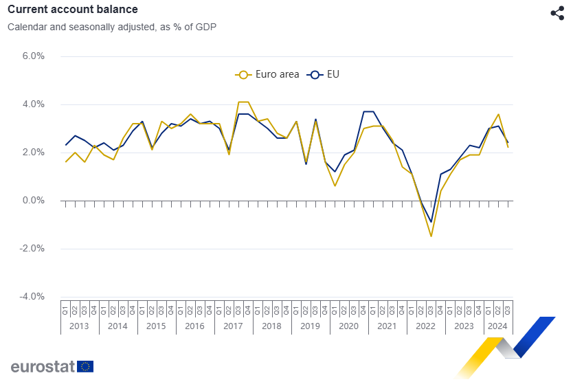 En el tercer trimestre de 2024, la balanza de pagos por cuenta corriente desestacionalizada de la UE registró un superávit de 106.000 millones de euros (+2,4 % del PIB), frente a un superávit de 136.200 millones de euros (+3,1 % del PIB) en el segundo trimestre de 2024 y un superávit de 99.400 millones de euros (+2,3 % del PIB) en el tercer trimestre de 2023.